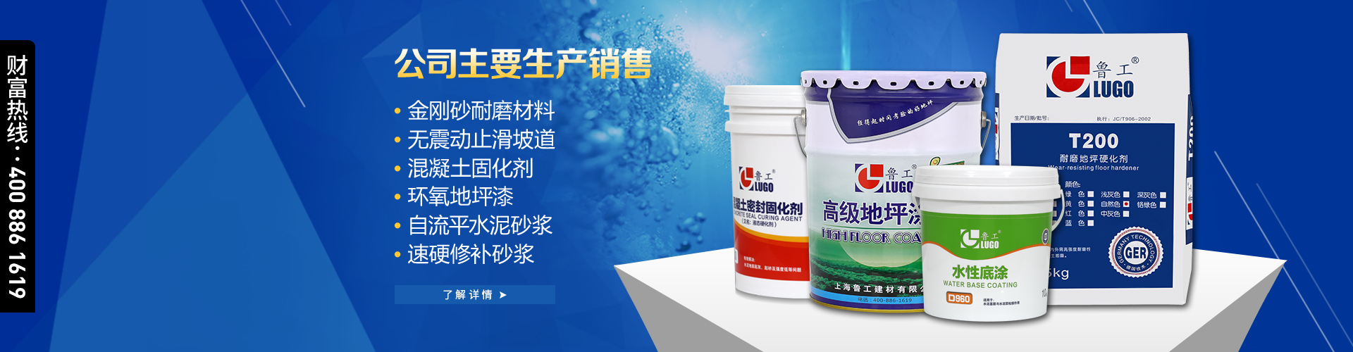 上海魯工建材有限公司——是一家集研發(fā),生產(chǎn),施工于一體的化學建材專業(yè)公司。產(chǎn)品主要包括環(huán)氧地坪,耐磨硬化地坪,運動場地,建筑干粉,以及建筑防腐,防水材料。 公司依靠科技人才優(yōu)勢,采用進口原料,不斷開發(fā)新產(chǎn)品,并根據(jù)不同的客戶需要,從實際考慮設計恰當?shù)姆桨福玫娇蛻粢恢抡J可,享有良好聲譽。 公司按照國家標準和行業(yè)標準,制定嚴格的生產(chǎn)流程和施工工藝,嚴格按照ISO9001國際質(zhì)量體系生產(chǎn)施工,目前公司已全面實施一套現(xiàn)代化的科學管理模式,以確保企業(yè)健康,快速發(fā)展。 我們以“質(zhì)量為先,誠信為本,服務為重”的 經(jīng)營理念,以“精益求精,永無止境”的企業(yè)精神,為您提供優(yōu)質(zhì)產(chǎn)品和滿意服務。
